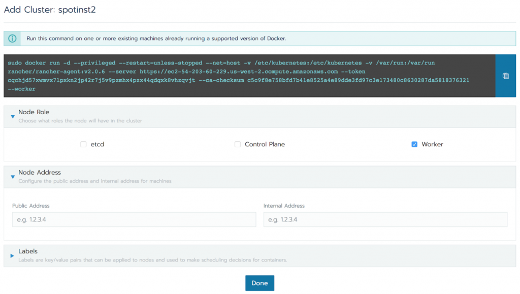 docker run -d --privileged --restart=unless-stopped --net=host -v /etc/kubernetes:/etc/kubernetes -v /var/run:/var/run rancher/rancher-agent:v2.0.6 --server <RANCHER_URL> --token <TOKEN> --ca-checksum <CHECKSUM> --worker --label spotinst.instanceId=$(docker run rancher/curl http://169.254.169.254/latest/meta-data/instance-id)